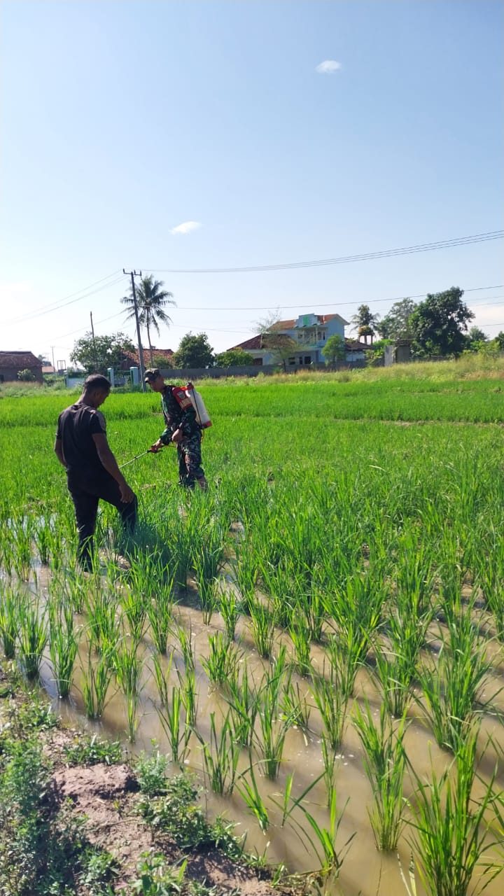 Babinsa Bantu Petani Menyemprot Gulma Tanaman Padi