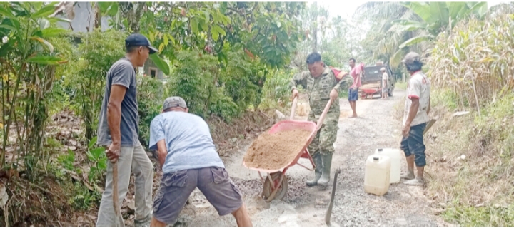 Babinsa Koramil 421-10/KTB Bantu Warga Gotong Royong Perbaiki Jalan