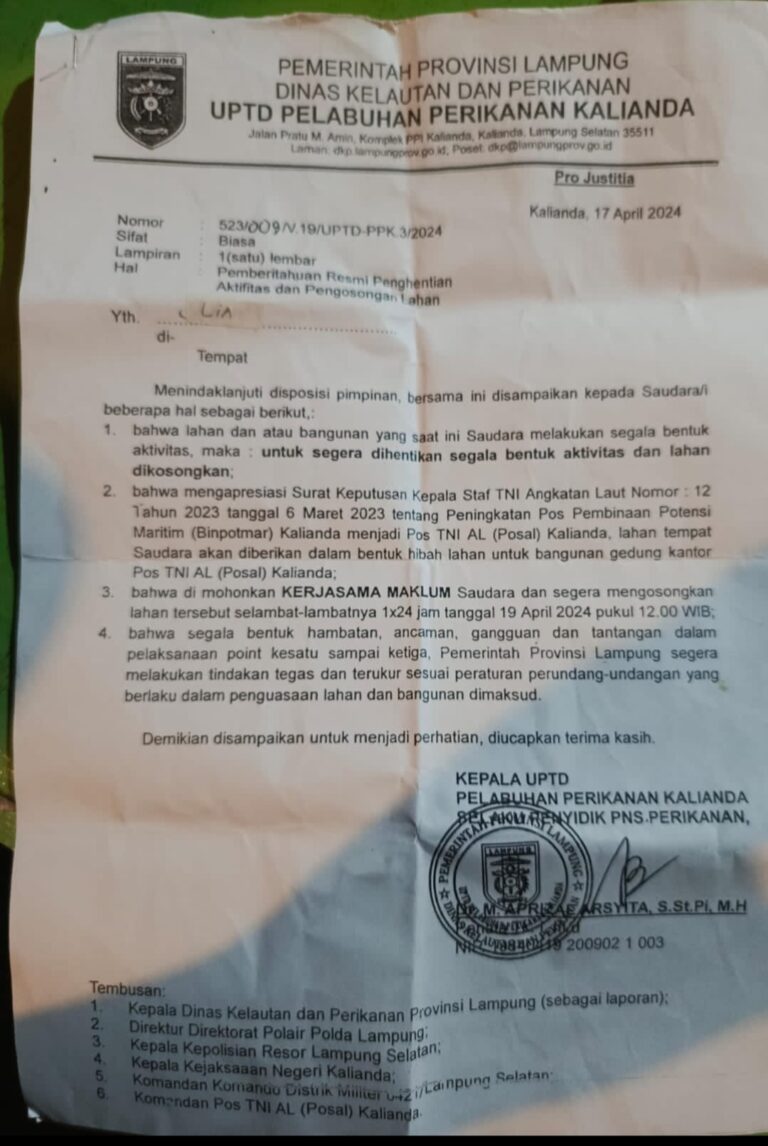 Berdasarkan data dan informasi yang berhasil dihimpun, permintaan pengosongan lahan tersebut oleh pihak UPTD PPI Kalianda melalui surat dengan nomor 523/009/V.19/UPTD-PPK.3/2024 tertanggal 17 April 2024 dengan perihal : Pemberitahuan Resmi Penghentian Aktifitas dan Pengosongan Lahan.