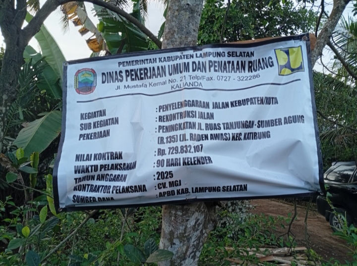 Seperti yang terjadi di jalan ruas Tanjungan Sumber Agung, Desa tanjungan, Kecamatan Katibung Kabupaten lampung selatan, kontraktor yang menangani kegiatan pembangunan jalan lapen APBD kabupaten lampung selatan yang terletak di areal perkampungan ini terlihat asal-asalan dalam pemasangan papan kegiatan proyek. Di duga karena nilai kontrak tidak mencapai ratusan juta, dan untuk mengirit pengeluaran biar tidak mengalami kerugian dalam pengepengerjaannya CV MGI hanya menempelkan papan kegiatan proyek tersebut di pohon rambutan milik warga.